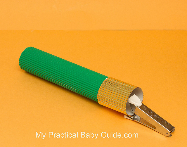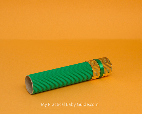 Step 3 Place the stripe of gold corrugated paper around the green roll, let it extend from the upper end, fit tightly and secure with a staple.