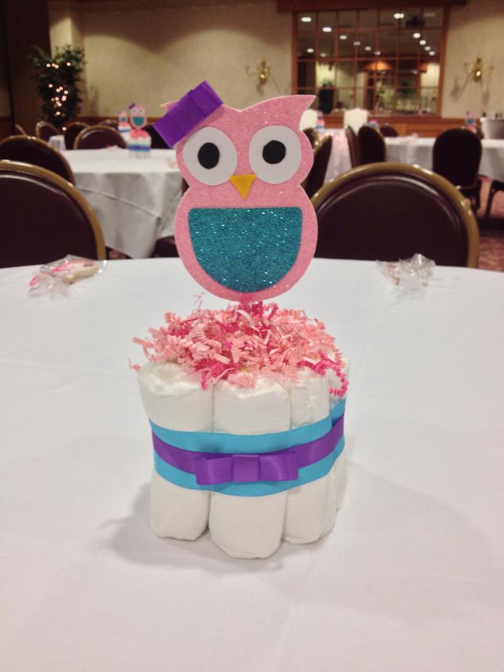 To go along with the theme I hand crafted 8 mini diaper cakes centerpieces using diapers, tied them with a ribbon. On top I have placed a shaped owl made from cardstock. These were a big hit!